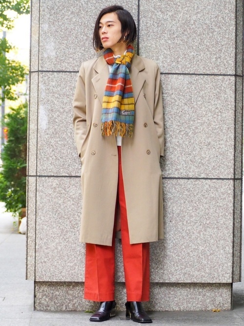 ロングコートとホワイパンツとを合わせたコーデです。丈は股下30㎝ほどに留めておき、ホワイトパンツの存在感をアピールしたコーデに仕上げましょう。インナーのオレンジのシャツとのカラーバランスも絶妙です。