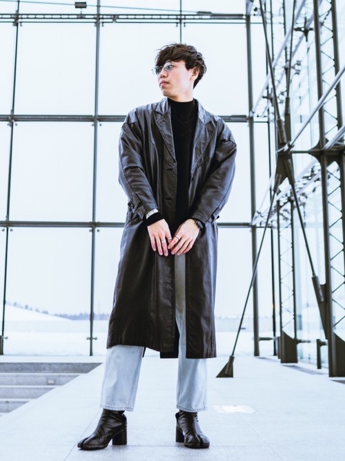 股下10㎝ほどのロングコートに、デニム生地のスラックスパンツを組み合わせています。ジェントルなロングコートに、セミカジュアルなパンツはとてもよくマッチします。足元のスニーカーにより、カジュアルよりには見えますが、それでもロングコートで大人の魅力のほうが勝っているメンズコーデです。