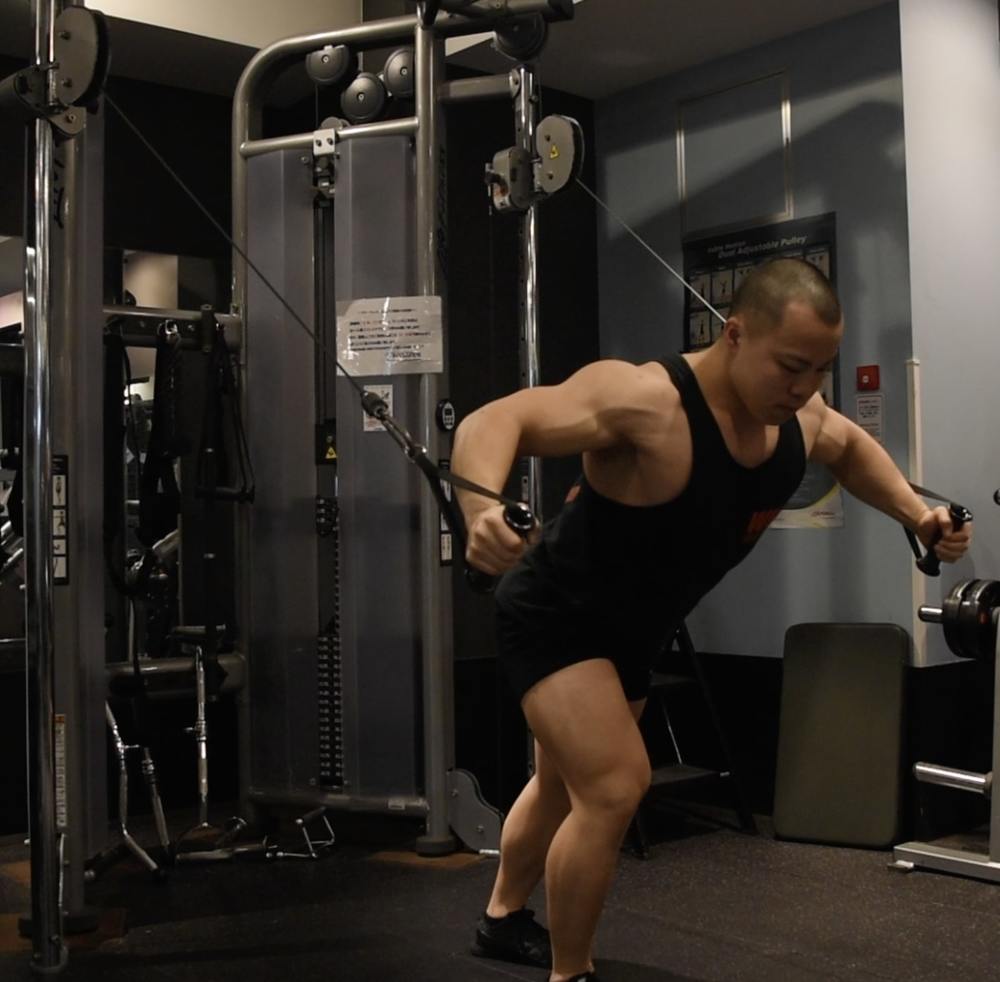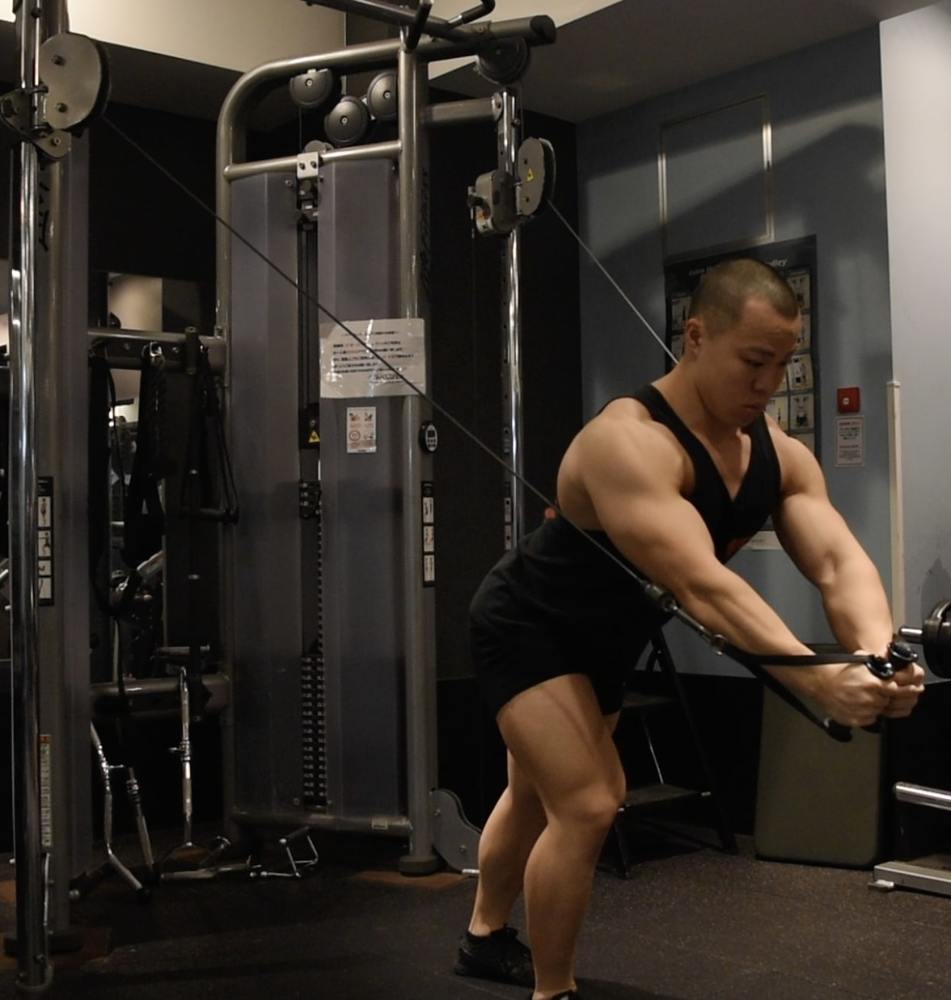 片手のみでのケーブルクロスオーバーにおいては上半身を前傾させるベントオーバーの姿勢よりも、片足を出すスプリットスタンスの直立姿勢のほうが動作を行いやすいこともあります。