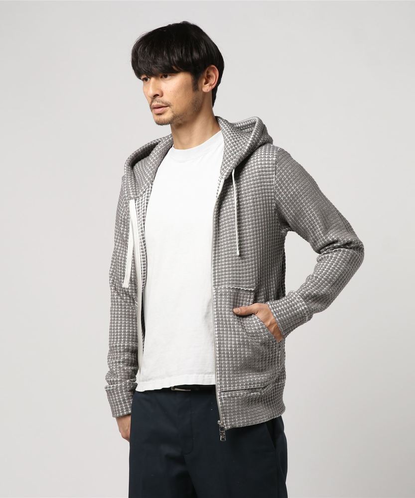 ワッフル素材が採用された独特な表情が魅力のフーデッドパーカです。コットンと化繊の混紡素材によるソフトな風合いと着心地が魅力となります。大人のオフスタイルをモダンに格上げする、リラックスムード溢れる一着です。