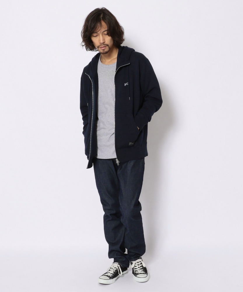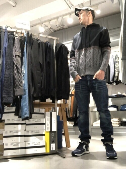 ルーズなシルエットの「SKIN JAPANDENIM」に、デザインニットパーカーを合わせたおしゃれメンズコーデです。キャップとスニーカーを使ってスポーツMIXをちょい足し。色落ち加工が施されたジーンズと、ツートンカラーのパーカーの存在感を活かした着こなしです。