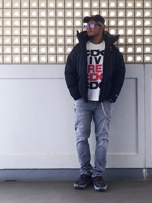 ゆったりとしたシルエットのジーンズに、ボリューミーなダウンジャケットを羽織ったスタイル。ジーンズはアメカジスタイルのメンズコーデと相性抜群です。インナーに英字Tシャツを合わせることで、ポップで若々しい雰囲気を演出できます。