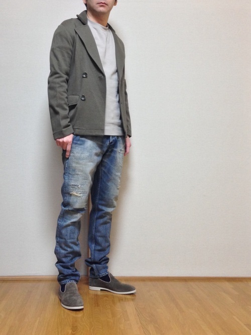 ジーンズにショート丈のテーラードジャケットを合わせたキレイめメンズコーデ。色落ち・ダメージ加工が魅力のジーンズ「TOKYO LTSWMIJSS」を着用しています。ライトな色味に合わせて、トップスとシューズはグレーをチョイス。ルーズなシャツとスリッポンでほどよくカジュアルさをプラスしています。