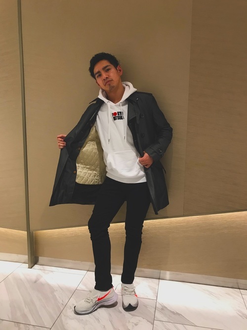 ジーンズ×パーカーは大学生に人気のメンズコーデです。鉄板コーデともいえるジーンズ×パーカーに、きれいめのトレンチコートを合わせたら、ちょっと落ち着いた大人の雰囲気に早変わり。足下はパーカーに合わせてカジュアルなスニーカーをチョイスしてまとまりを出しています。