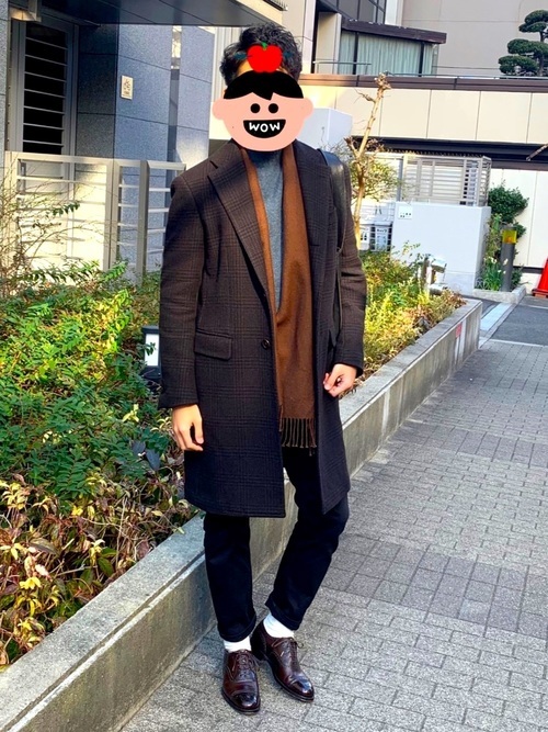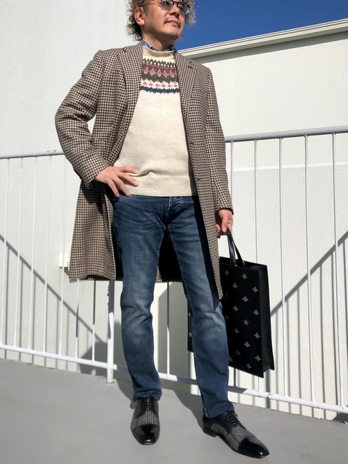 こちらもジーンズにチェスターコートを合わせたメンズコーディネートです。コート・シューズ・バッグを揃えたきれいめ色の強いコーデですが、インナーにセーターを合わせることでほどよくカジュアルをプラス。堅くなりすぎず、バランスよく着こなしています。