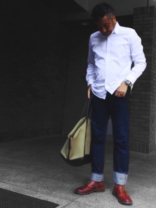 デンハムの「RAZOR LTSWMIJVS」を使用したメンズコーデです。色落ち・加工無しのリジッドデニムの色味を活かして、トップスにはシンプルなホワイトシャツをチョイス。ビジネス風のきれいめテイストでまとめたおしゃれな着こなしです。