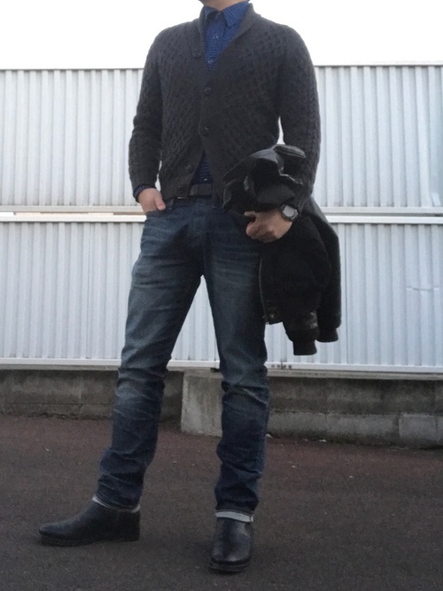ジーンズにシャツとカーディガンを合わせたオフィススタイルのコーディネートです。第一ボタンまで留めてカチッと引き締めて、上品で落ち着いた大人のメンズを演出。デニムジーンズがダークカラーなので、トップスやシューズもブラックでまとめて統一感を出すのがポイントです。