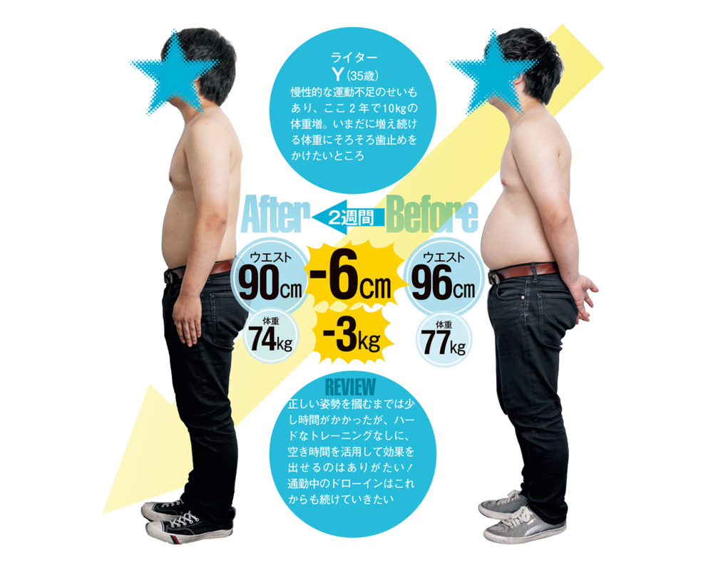 普段から運動不足だったというこちらの方は、増え続ける体重を何とかするためドローインを始めて約一週間で1~2cmほどのお腹痩せに成功しています。電車内で立ちながらのドローインだけでなく自宅では四つん這いでのドローインなども取り入れ始め、結果2週間で体重は3kg痩せウエストは6cm減となったそうです。