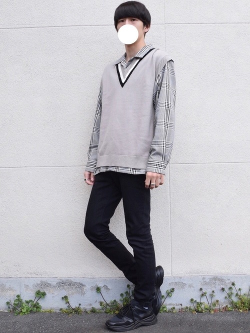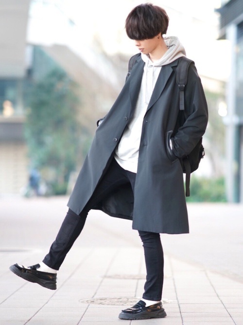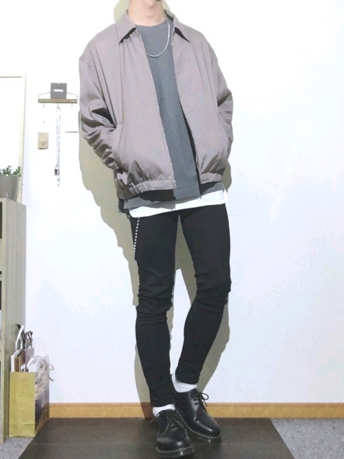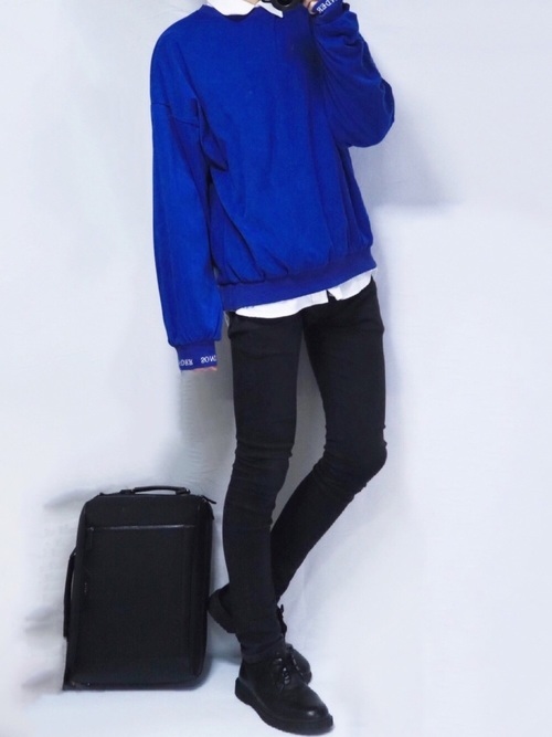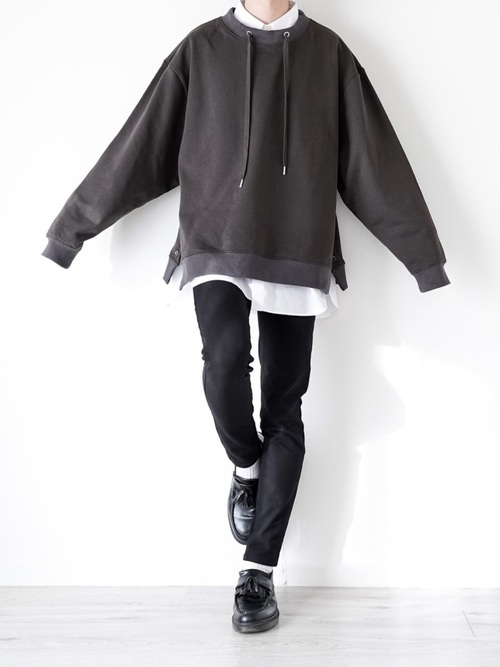真っ黒のスキニーパンツにくすみカラーのスウェットと白シャツを合わせた王道かつおしゃれな着こなしです。スウェットを黒ではなく少し明るい色味にしたことで、抜け感がでて一味違った雰囲気に。足元はきれいめの靴でスマートさをプラスしています。