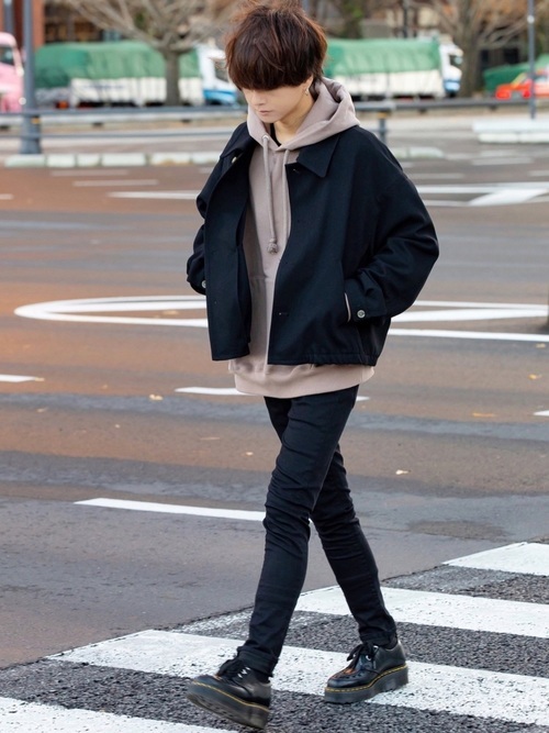 黒スキニーパンツ×ワイドブルゾン×ワイドパーカー