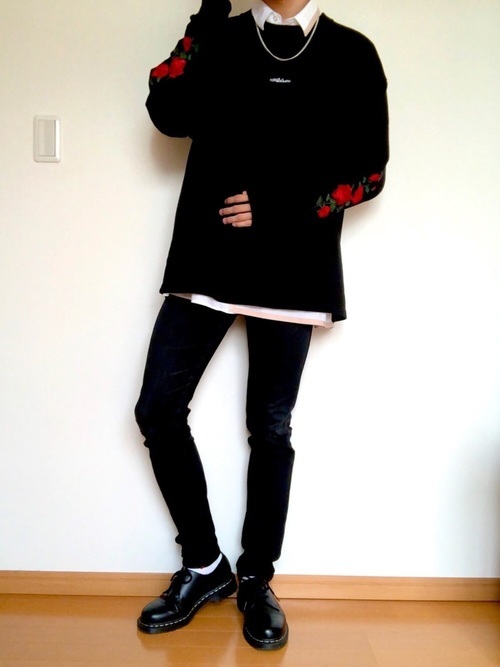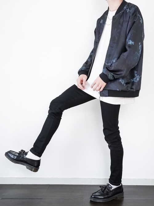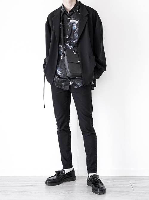 フラワー柄はメンズでは敬遠されがちですが、このようにダークトーンをチョイスすることでかっこいい着こなしになります。また全体を黒でまとめているので、モードでかっこいい装いに。