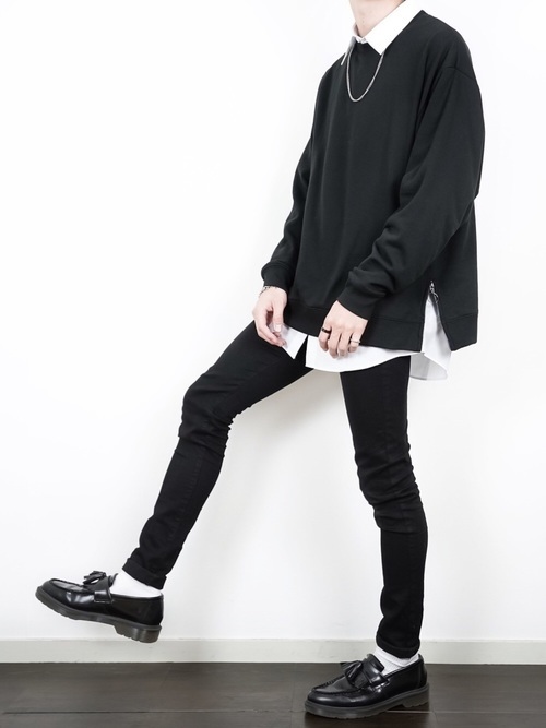 黒スキニーパンツ×黒スウェット×白シャツ