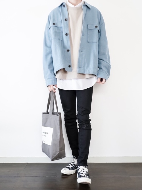 ベージュスウェットや白シャツ、淡いデニムジャケットを合わせた爽やかな春らしいコーデです。本来なら野暮ったくなりがちな淡い色のコーデですが、黒スキニーと合わせることでメリハリがつき洒落感がある着こなしに。黒は何でも合うという意味が良くわかるコーデとなります。靴も黒のスニーカーであくまでも引き締め役ということがポイントです。