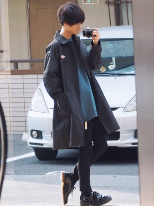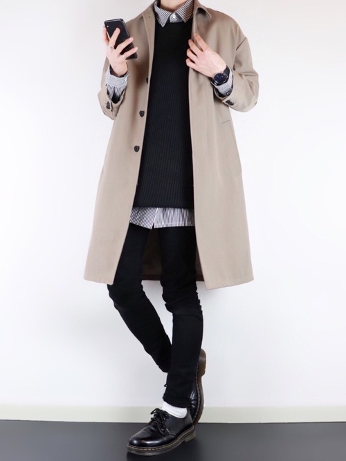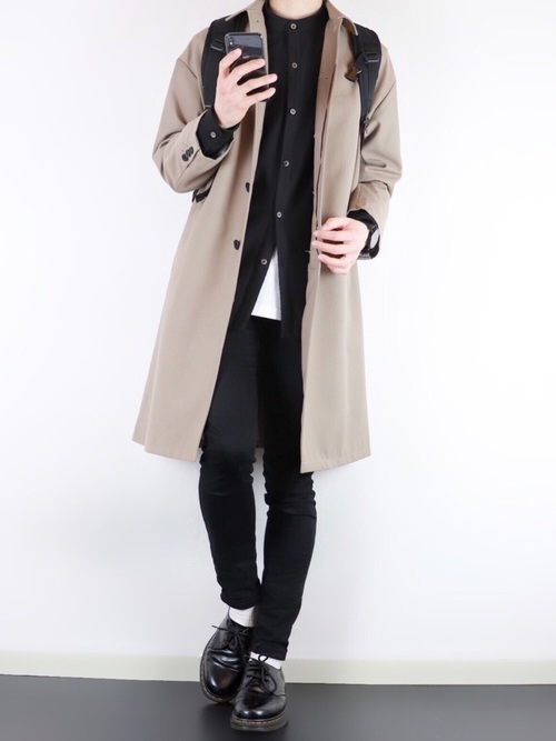 黒スキニーパンツ×ネイビーステンカラーコート×きれいめシャツ