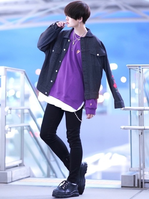 黒スキニーパンツに派手カラーのスウェットを合わせることで、奇抜になりすぎず程よく個性がある着こなしになっています。定番のTシャツレイヤードで洒落感をさらに高め、アウターは黒のデニムジャケットで洗練された装いに。