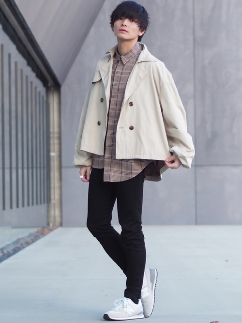 黒スキニーパンツ×チェックロングコート