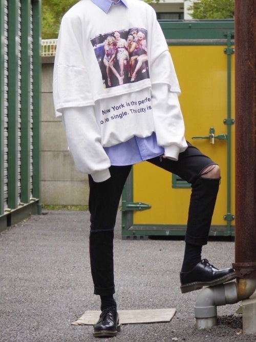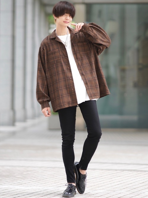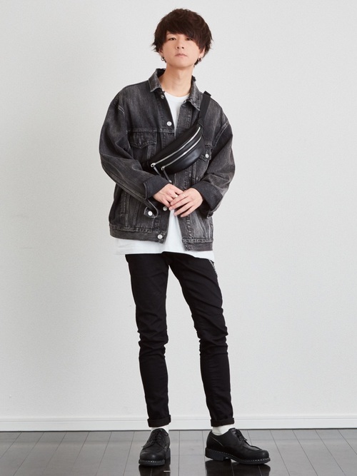 ダメージの入った黒スキニーとオーバーサイズシャツを合わせたモードなコーデです。インナーにブルー系のストライプシャツを合わせることで、若干のきれいめ要素が加わりモードに振り切りすぎず程よい着こなしになっています。足元は革靴を合わせて、あくまでもコーデの引き立て役に。