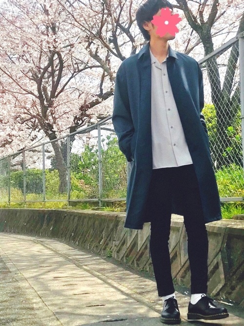 ネイビーステンカラーコートときれいめシャツを合わせた春定番コーデです。きれいめシャツをあえてルーズに着ることで、堅い雰囲気を払拭したおしゃれな着こなしに。足元に白の靴下を合わせて今どきの洒落感を取り入れることも忘れていません。