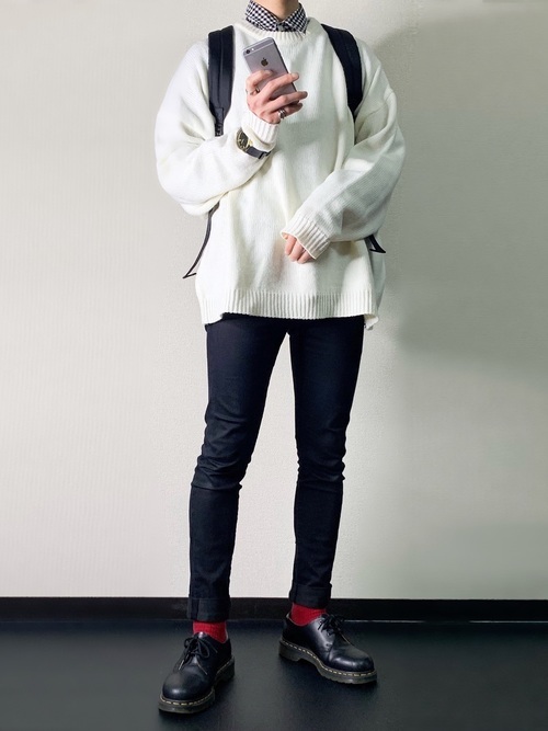黒スキニーパンツと白ニットの組み合わせは、春らしく明るい雰囲気が漂うのでおすすめのコーデです。インナーにチェックのシャツをレイヤードすると、少し華やかさがある着こなしになります。足元はきちっと感がある靴を合わせ、靴下の赤でアクセントを。