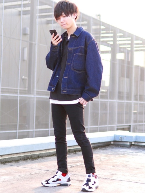 黒スキニーパンツとデニムジャケットのコーデに、ごつめスニーカーがとてもおしゃれに映えています。黒のシャツに白のTシャツをレイヤードすることで、コーデにメリハリがつきスニーカーがコーデに馴染む後押しに。
