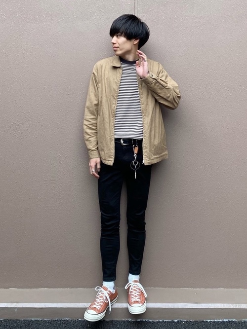 黒スキニーパンツに、ボーダーTシャツとベージュシャツを合わせて春らしいナチュラルな装いに。靴もオレンジ系のスニーカーにしているので親しみ深い着こなしになっています。またシルエットもオーバーすぎずぴちっとしすぎず程よいです。