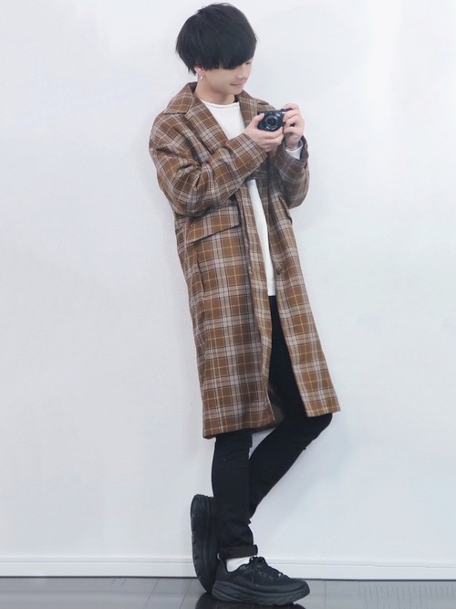 チェックロングコートを合わせて周りとは差別化されたおしゃれな着こなしです。ロングコートは黒スキニーパンツとの相性が良く、さらに無地ではなくチェックにすることで華やかさと季節感をともに獲得。コートは堅すぎると感じている方はチェックロングコートを選んでみてはいかがでしょうか。
