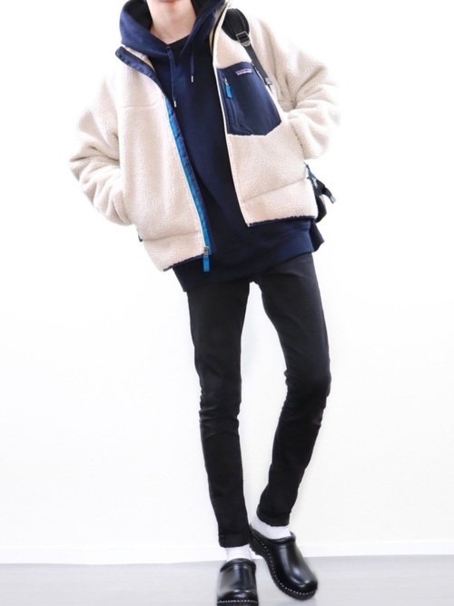 ワイドパーカー・シャツブルゾンを合わせたカジュアルコーデです。黒のスキニーパンツなのでワイドのトップスを合わせても野暮ったくならず、きれいなシルエットに。アウターからパーカーのフードがでているのは、抜群におしゃれに見えるので初心者の方におすすめしたい着こなしです。