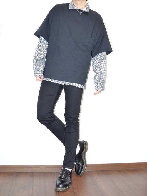 黒スキニーパンツ×長袖白Tシャツ×半袖黒シャツ