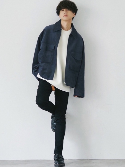 黒スキニーパンツ×ネイビーブルゾン×白ニット