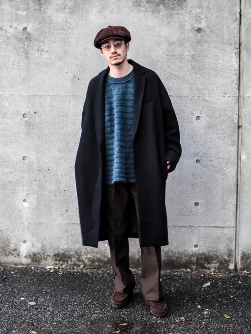 アンユーズドのターコイズブルーのニットを着用したメンズコーデ。ドロップショルダーでコクーンシルエットのコートがトレンド感のあるシルエットを演出。ニットのカラーとボーダー柄がアクセントになり、メリハリが生まれています。パンツ、ローファー、ハンチング帽はブラウンで統一し、クラシカルなムードが漂うスタイリッシュな着こなしに仕上がっています。