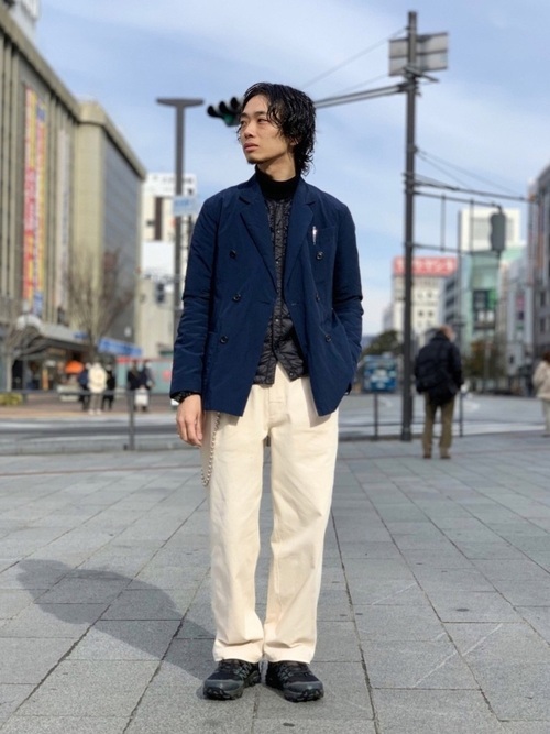 アンユーズドのテーラードジャケットにNANGAのインナーダウンをレイヤードし、すっきりとしたシルエットの中にもウォーム感のある着こなしに。ルーズテーパードシルエットのきれいめのチノパンと黒のスニーカーで、適度なフォーマル感とこなれ感を両立したメンズコーデに仕上がっています。