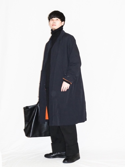 アンユーズドのステンカラーコートを着用したオールブラックコーデ。存在感のあるオーバーサイズのコートとワイドパンツが旬のシルエットを作り、タートルネックのインナーがバランスを整えています。コートのオレンジの裏地がアクセントに。