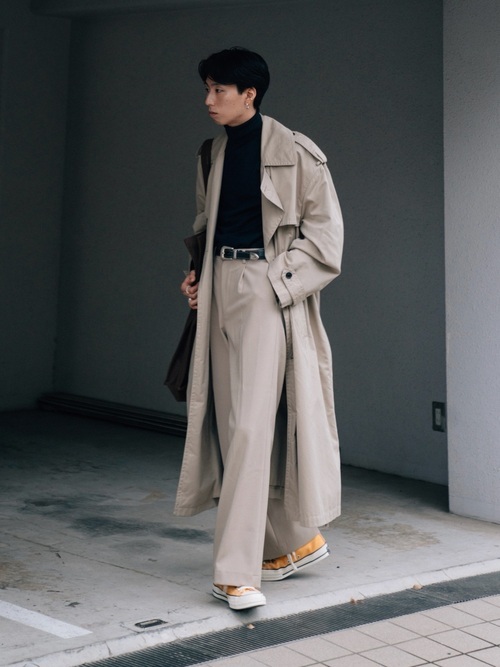 着丈が長く、モードな雰囲気のアンユーズドのトレンチコートを着用したメンズコーデ。ベージュのきれいめパンツを合わせて洗練されたベージュコーデに。黒のタートルネックニットがシルエットバランスを整え、着こなしを引き締めています。足元はイエローのCONVERSEで抜け感をプラス。