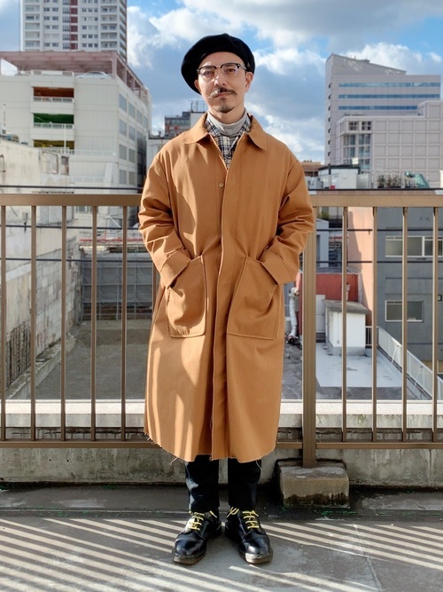 アンユーズドのブラウンのステンカラーコートを着用したメンズコーデ。コートのゆったりとしたサイズ感とフロント部分の大きめのポケットがポイントです。チェックシャツとタートルネックのインナーで首元にアクセントを加え、コーデのバランスアップに。トラックパンツとDr.Martensのブーツで軽快な足元に仕上がっています。