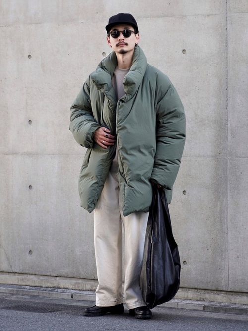 アンユーズドのオーバーシルエットのダウンジャケットが存在感を放つメンズコーデです。カーキとモノトーンの落ち着いた色合いで、洗練された印象の着こなしに。ゆったりとしたシルエットのリラックス感をサングラスとキャップで引き締めて、こなれ感のあるスタイルに仕上がっています。