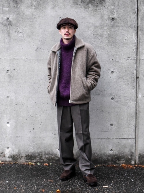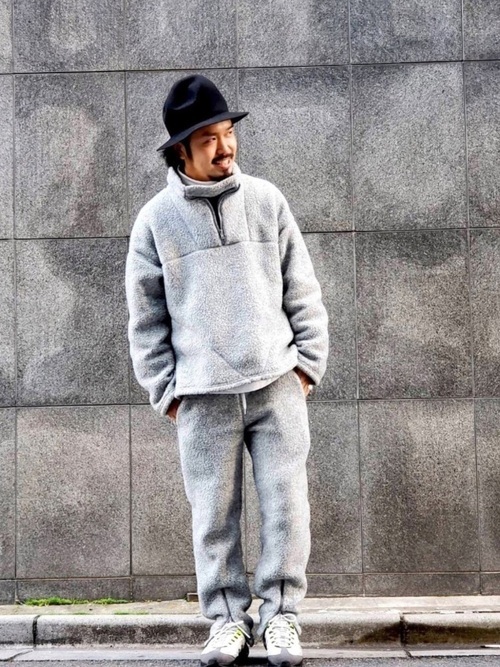 アンユーズドのフリースのセットアップを着用したカジュアルコーデ。程よいゆとりのあるすっきりとしたシルエットで、トレンド感とウォーム感のある着こなしに。マウンテンハットがアクセントになっています。