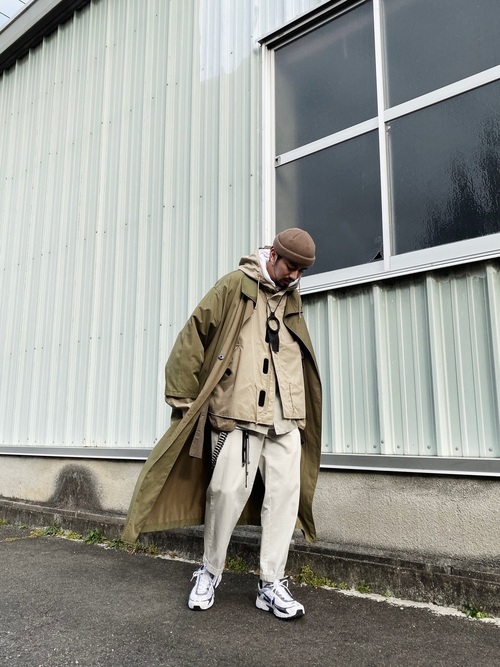 シンプルなコーデにアンユーズドのメッシュバッグがアクセントになったメンズコーデ。袖のデザインが特徴的なオーバーサイズのコートがニュアンスのある旬のムードをかもし出しています。ブラウンベースの上品なコーデを、バッグやスニーカーの黒が効果的に引き締めています。