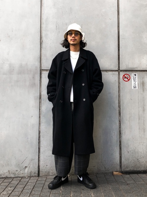 アンユーズドの白のバケットハットがクリーンなメンズコーデ。顔まわりに白を配置したモノトーンコーデなので、重さを感じさせず鮮度の高い着こなしに。オーバーコートとグレーのワイドパンツが旬のシルエットを演出しています。