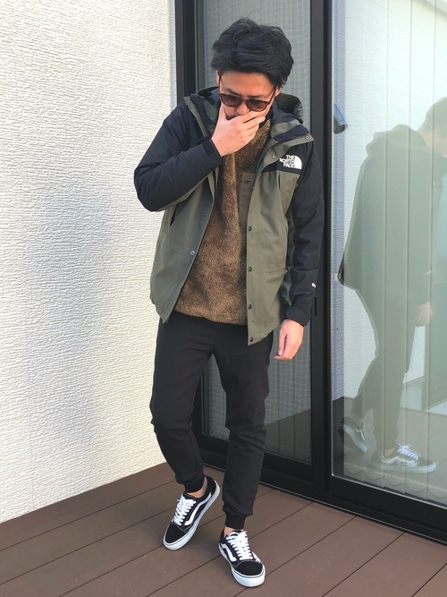 こちらのメンズコーデは、ブラックオリーブのマウンテンパーカーに黒のスラックスを合わせています。もこもこのブラウンのトップスは柔らかい雰囲気があり、それぞれのアイテムを上手くなじませています。ちょっとした街着などのメンズコーデにおすすめです。
