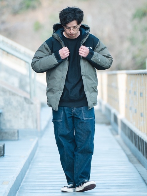 ノースフェイスのダウンジャケットに、ゆったりシルエットのデニムパンツを合わせたコーディネートです。ダウンジャケットにゆったりめのボトムスを合わせ、Iラインのシルエットでおしゃれに着こなしています。冬本番にもおすすめです。