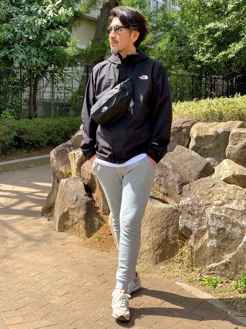 黒のノースフェイスのマウンテンパーカーに、グレーのスウェットパンツを合わせたコーディネートです。すっきりとした丈のマウンテンパーカーなら動きやすく、アクティブに活動したいときにおすすめ。アウトドアだけでなく、イベントの時などにもぴったりのメンズコーデです。