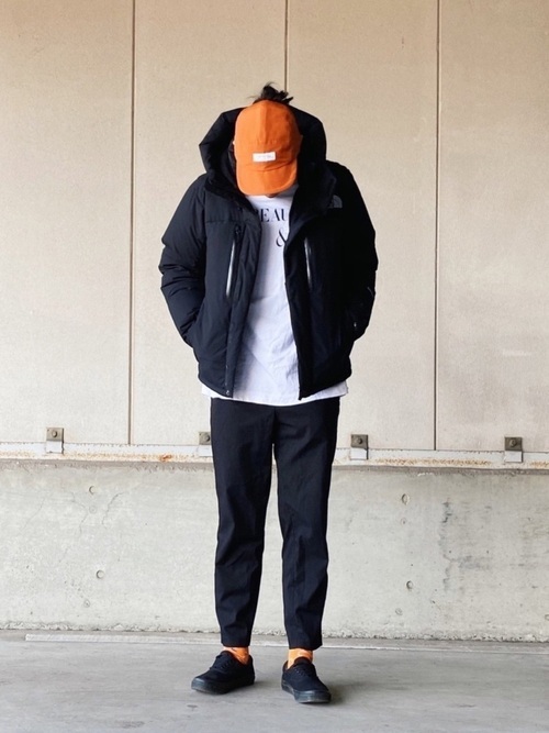黒のノースフェイスのダウンジャケットに白のトップス、黒のパンツのコーデ。コーデ自体はとてもシンプルですが、そこにオレンジのキャップを合わせることでこなれ感のあるおしゃれなメンズコーデに仕上がっています。差し色を上手く取り入れることで、他と差のつくおしゃれな着こなしになります。