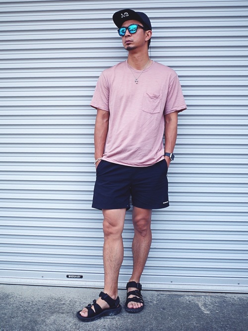 アイスブレーカーのTシャツを使ったコーディネートです。シンプルなTシャツとハーフパンツのコーディネートですが、キャップやブレスレットなどのアクセントが効いています。シンプルだけど、おしゃれな着こなしです。インパクトのあるTシャツの色がとてもきれいです。