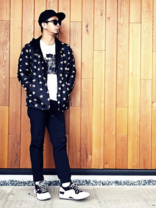 スタジャンにアイスブレーカーのパーカーを合わせたコーディネートです。インナーのパーカーのフードを出すという定番のおしゃれです。画像は暗くてあまり見えないですが、Onitsuka Tigerのスニーカーもアクセントになっています。全体的にバランスのとれた着こなしです。
