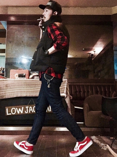 ブラックのダウンベストとフランネルチェックシャツのアメカジミックスコーデです。かっこよさと可愛さが見事に融合しています。チェックシャツとスニーカーの色を赤で揃えていておしゃれです。