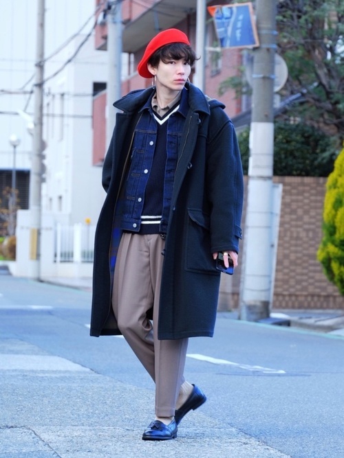 ブルーのダッフルコートとトレンドライクなワイドテーパードパンツのトラッドスタイルです。赤のハンチングが差し色になっていてコーデのアクセントになっています。インにブルゾンとシャツ、セーターを重ねていますが、寒色系でまとめているのでバランスがよいです。