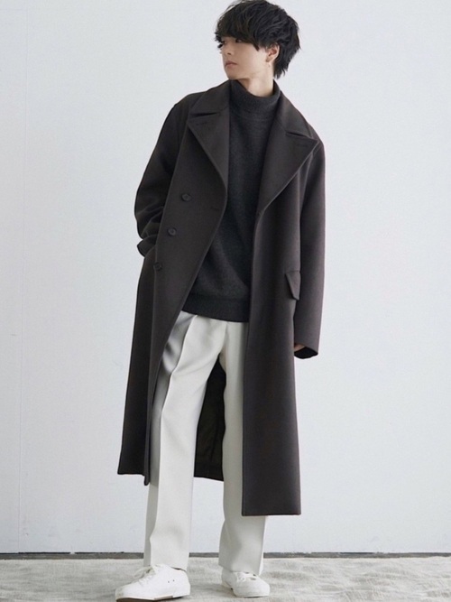 ミニマルデザインのチェスターコートとホワイトスラックスの清潔感があふれる組み合わせが上品なコーデです。全身ブラックではなく、足元をホワイトでまとめているのでコーデにメリハリが生まれています。ブラウンのコートが引き立つように工夫した素敵なコーデです。