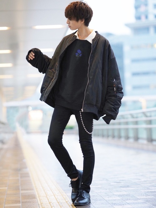 ビッグシルエットのボンバージャケットとブラックのスキニーを合わせたクールなブラックコーデです。ホワイトのシャツを入れてあげることで、全体が重くなり過ぎずにまとまっています。スウェットにデザインされたさりげない青いバラのロゴが素敵です。