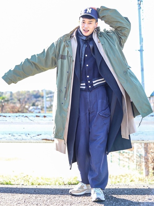 、M-65の5つのアウターを重ね着しています。バランスが悪そうに思えますが、キャップとスタジャンの相性は抜群なので全体もきれいにまとまって見える不思議なコーデです。