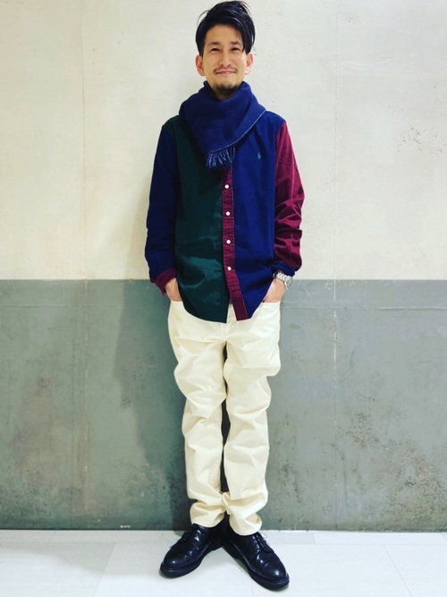 502の白のコーデュロイパンツの着こなしも大人かっこいい。シンプルなカラーのトップスには、カラフルなシャツを投入してきれい目にまとめるのもアリです。